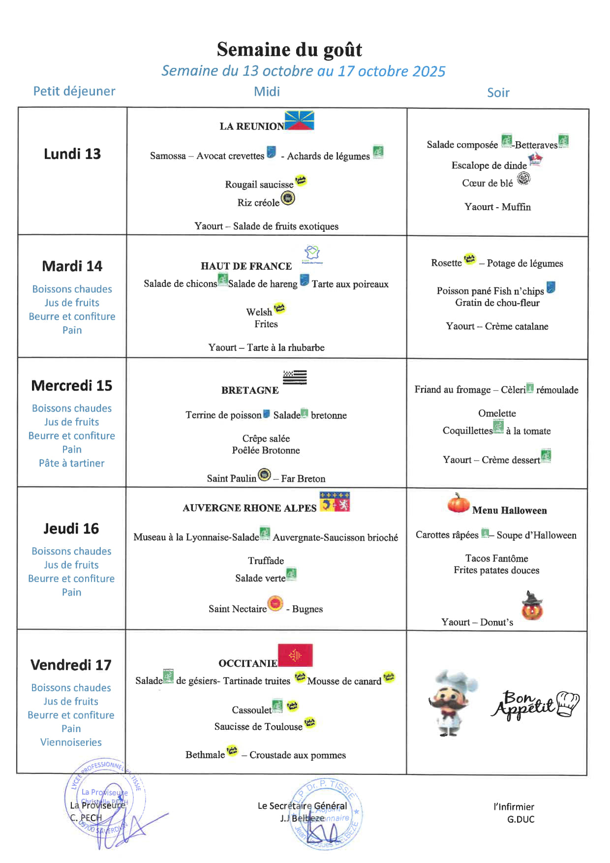 Menu semaine du 13 au 17 octobre 2025 Bon appétit.